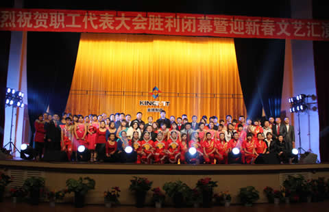 為了慶祝公司第一屆一次職工代表大會順利閉幕,活躍公司廣大職工的文化生活,讓員工提前度過一個歡樂、祥和的春節(jié),在公司黨支部和工會委員會的精心策劃下,在基層分會全體員工的的共同努力下,加班加點排練節(jié)目,為了使每個動作表演到位有效果,演出精彩上檔次,職工對節(jié)目一遍又一邊遍的進行排練、修正,并籌集了演出的服裝、道具,以最高的表演水平充分展示金維公司員工的良好精神面貌。2013年1月19日下午16時,由公司黨支部和工會委員會聯(lián)合舉辦的慶祝公司第一屆一次職工代表大會順利閉幕暨“迎新春”文藝節(jié)目匯演大型晚會,在一片歡慶祥和的新春祝語聲中拉開了帷幕,公司總經(jīng)理陳德剛、副總理高勇、副總經(jīng)理魏偉、財務(wù)總監(jiān)高廣禮、生產(chǎn)總監(jiān)王智和公司工會主席劉海玉等領(lǐng)導(dǎo)和公司全體員工觀看了文藝節(jié)目演出活動。